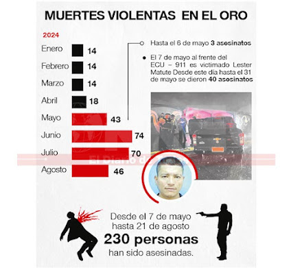 Tras el asesinato de Luis Vinces, desde el 7 hasta al 31 de mayo mataron a 40 personas; en junio, 74; julio, 70; y en lo que va de agosto, a 46.